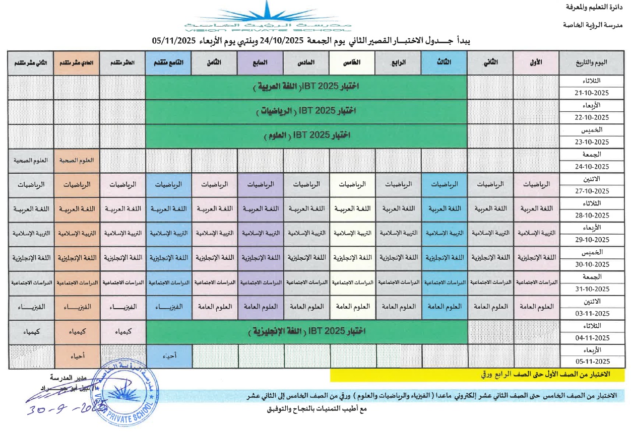 جدول الاختبار القصير الثاني الفصل الدراسي الأول 2025-2026 من الصف الأول إلى الصف الثاني عشر.jpg