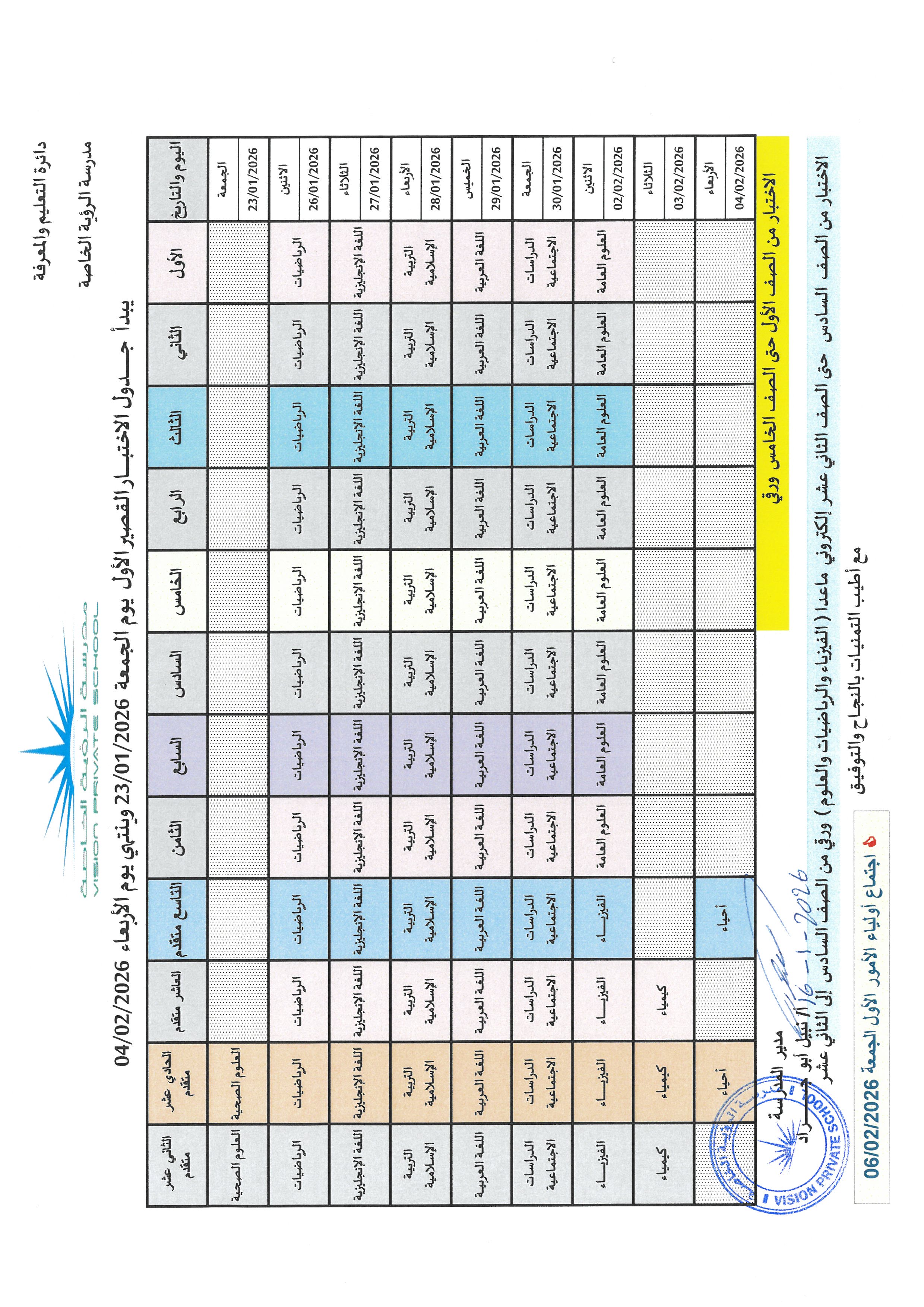 يبدأ جــــــــــــــــــدول الاختبــــــــــــار القصير الأول يوم الجمعة 23/01/2026 وينتهي يوم الأربعاء 04/02/2026